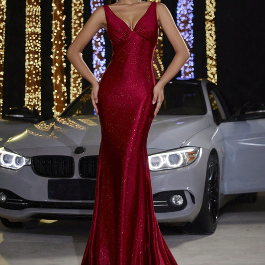 Deep V Strap Fishtail Evening Dress